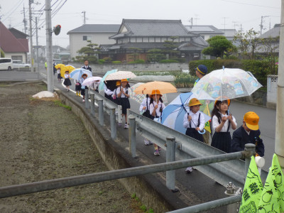 あいにくの雨☔でしたが、傘をさして、しっかりと一列に並んで歩くことができています👍